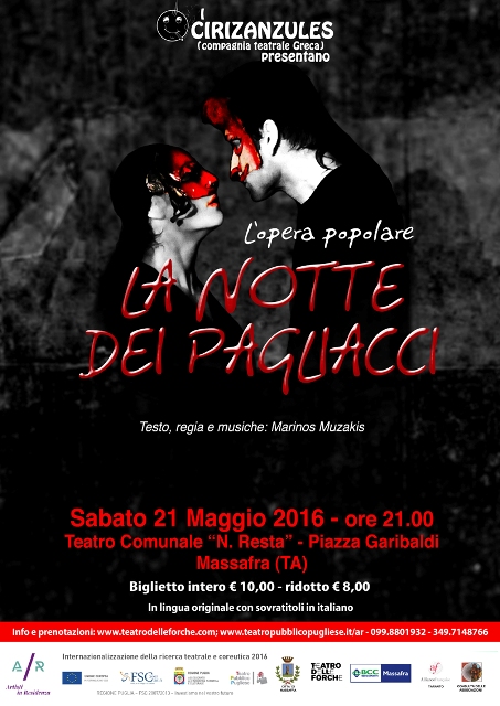 “La notte dei pagliacci” è stata strutturata dai materiali teatrali che abbiamo raccolto dall’esperienza di un ciclo di ricerca, che abbiamo iniziato con le “Tsiritsantsoules” nel 1999, sulla commedia laica e sul teatro di strada, che si erano sviluppati attraverso i secoli. Questo emozionante percorso iniziò con l’antico dramma satiresco, passò attraverso la commedia romana, dai buffoni del medioevo, dalla commedia del Rinascimento, dalla commedia dell’arte per arrivare fino a Karaghiozi, il cabaret, i clown e gli artisti di strada del nostro secolo. Abbiamo avuto la possibilità di lavorare insieme ad insegnanti importanti come Kitti Arseni, Miroslav Kocur, Carlo Formigoni, Athos Danellis e studiare le loro tecniche. Utilizzando tutta questa esperienza, abbiamo composto questa dolce e amara opera, parlando di una società che deve cambiare, ma anche della natura del pagliaccio, così come noi la percepiamo”.